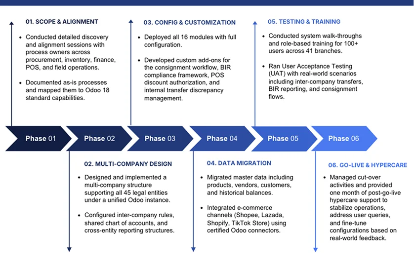 The Chris Sports Odoo 18 implementation stands as one of the most comprehensive retail ERP deployments in the Philippines. With 45 legal entities, 100+ users, 41 branches, full BIR compliance automation, a custom consignment module, advanced approval hierarchies, and four e-commerce integrations, this project demonstrates what is possible when deep Odoo expertise meets complex enterprise requirements.